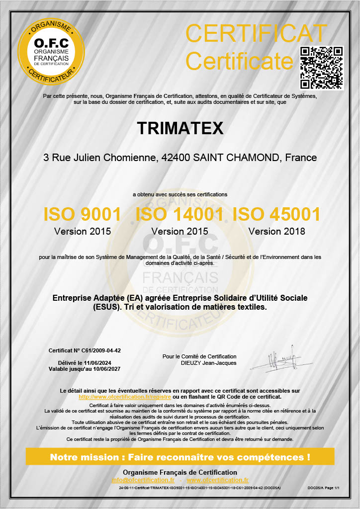 Trimatex a mis en place un système de management QSE intégré, certifié selon les normes ISO 9001, ISO 14001 et ISO 45001, attestant de son engagement en matière de qualité, d’environnement et de santé et sécurité au travail.